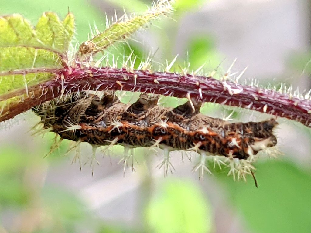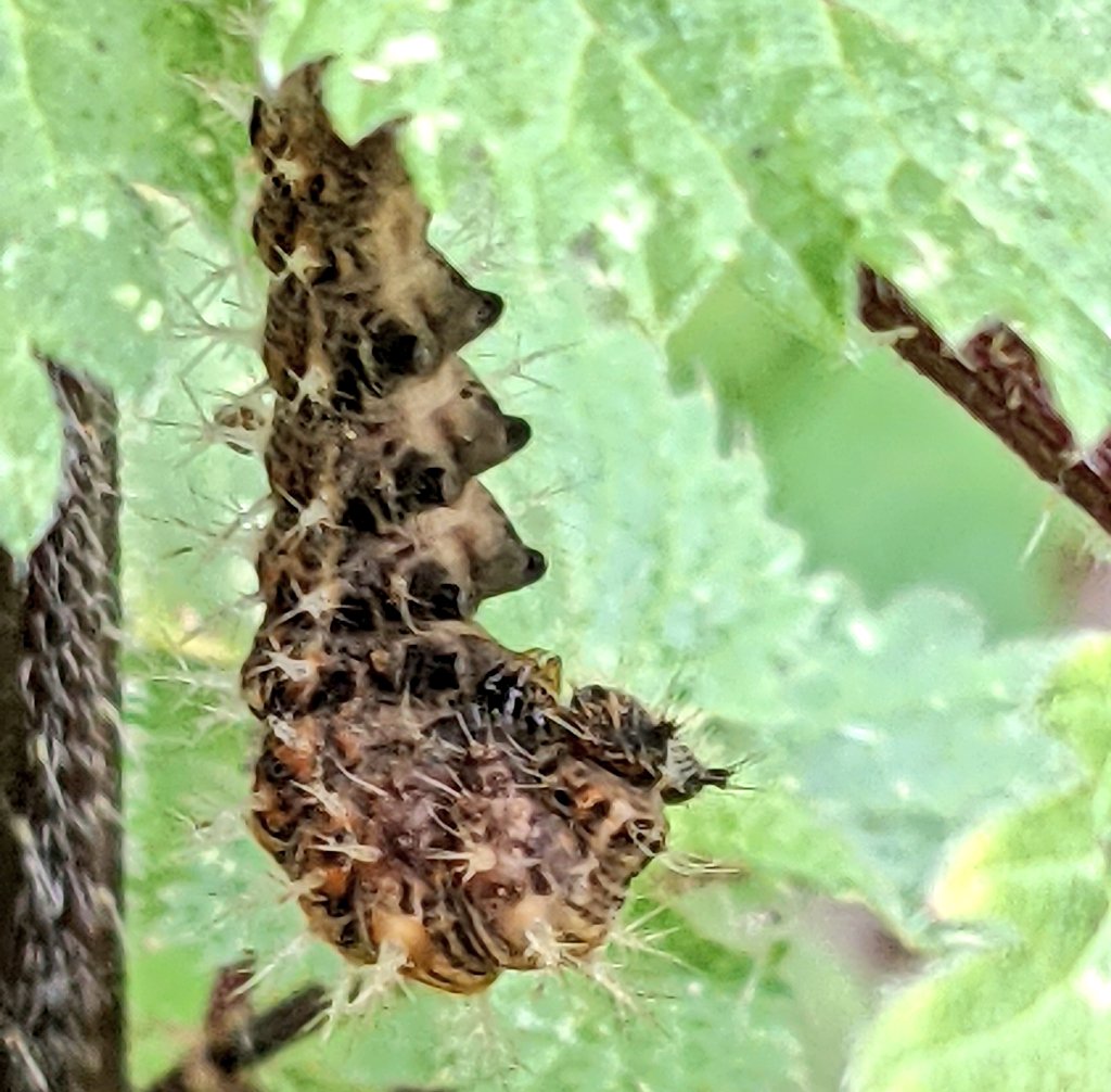 Encourage butterflies to lay eggs by providing popular food source for their caterpillars like nettles (popular with Peacocks, Red Admirals and as it turns out Commas). I’ve found, to my great excitement , 4 Comma – erstwhile caterpillars, now – chrysallises on this skimpy, shady patch of carefully nurtured nettles! (Nettles apparently like lots of nitrogen, so I’ve put my few grass clippings on them which seems to work well.)