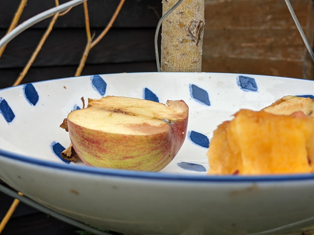 …Was very worried that is, until remembering early this morning I’d read somewhere recently that to encourage butterflies into your garden this time of year, you can put out rotting fruit! They can feed off the sweetness, good as nectar for them which is their normal rocket fuel! Phew. So I found an damaged apple on my walk and put it I’ve hung a bowl along with peach remains on the nearby willow! Job done, hopefully.